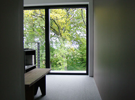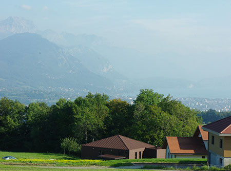 L’objet du projet était, entre autre, de protéger l’intimité des habitants de la maison tout en leur proposant une expérience de projection dans le paysage. Ce dernier est double, composé au Sud d’une canopée et à l’Est d’une vue dégagée sur un massif des Alpes (le Parmelan). A noter qu’au Sud, lorsque les feuilles tombent, une vue filtrée par les branches s’ouvre sur le lac d’Annecy.