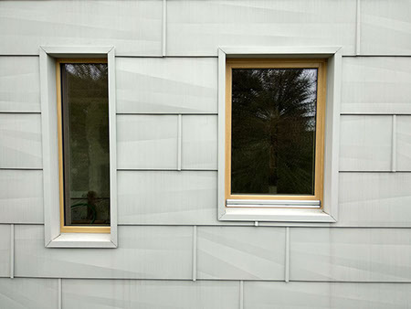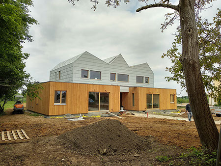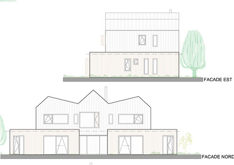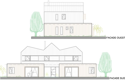 La façade de l’étage est habillée d’un bardage aluminium et la façade du RDC par un bois brut qui sera ensuite traité selon les orientations de façon écologique afin de garantir un vieillissement élégant.