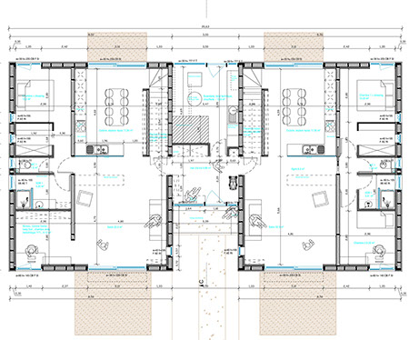 Les espaces communs accueillent les espaces suivants: hall d’entrée, buanderie, chaufferie au RDC, atelier/salle de jeu/lecture, chambre d’amis à l’étage. Par un jeu de clés à l’étage, l’atelier et la chambre d’amis peuvent être privatisés par l’une ou l’autre famille selon les besoins.