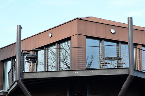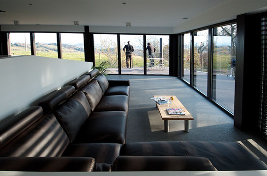 La maison se présente dans sa face publique par un visage sobre et fermé (qui sert également de tampon thermique au Nord) puis une membrane de distribution retourne l’expérience de l’utilisateur qui se retrouve confronté à la beauté du paysage une fois le pied posé dans la pièce de vie.